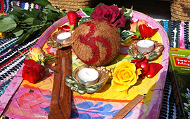 Mit Blumen, Öllampen und Weihrauch bunt geschmückte