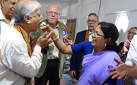 Der Kuchen wurde symbolisch von Herrn General Konsul Iversen angeschnitten. Damit übergab er feierlich die Backstube an die Mitglieder der Sunderban Frauen Selbsthilfe Gruppe Kooperative Gesellschaft. |